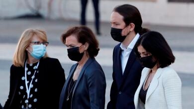 La vicepresidenta del Gobierno, Carmen Calvo, ha mostrado su gratitud a los familiares de las víctimas del coronavirus y a todas las autoridades que han acudido al funeral de Estado en el patio del Palacio Real.