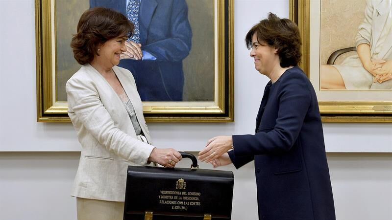 La vicepresidenta del Gobierno, ministra de la Presidencia, Relaciones con las Cortes e Igualdad, Carmen Calvo, ha prometido ser una "jueza implacable" de sí misma para "estar a la altura" de la cartera que ha recibido de manos de la vicepresidenta saliente, Soraya Sáenz de Santamaría.