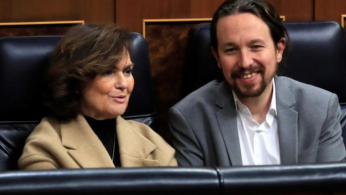 Tras las primeras fisuras entre los ministros del PSOE y de Unidas Podemos, Pablo Iglesias y Carmen Calvo han querido dar apariencia de unidad y los dos vicepresidentes han salido juntos del hemiciclo para ser captados por las cámaras de televisión en actitud de camaradería.