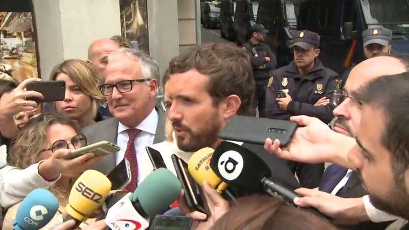 El presidente del PP, Pablo Casado, ha pedido al presidente del Gobierno en funciones, Pedro Sánchez, que actué con "ley y orden" en Cataluña, y que no dialogue ni negocie con el presidente de la Generalitat, Quim Torra. "No cabe apelación al diálogo, sino a la concordia. No cabe una apelación a la negociación, sino a la ley y al orden", ha afirmado en declaraciones a los medios ante la Jefatura Superior de Policía de Barcelona, donde ha ido a mostrar su apoyo a los agentes de la Policía Nacional que han intervenido estos días en Cataluña, en una visita que ha coincidido con la del presidente del Gobierno. Ha sostenido que "el Gobierno no debe abanderar el apaciguamiento, sino la firmeza democrática con todos los instrumentos que la ley pone a su disposición", y ha pedido a Sánchez que responda a las llamadas de Torra para romper los pactos que el PSC tiene con JxCat y ERC en ayuntamientos y en la Diputación de Barcelona.