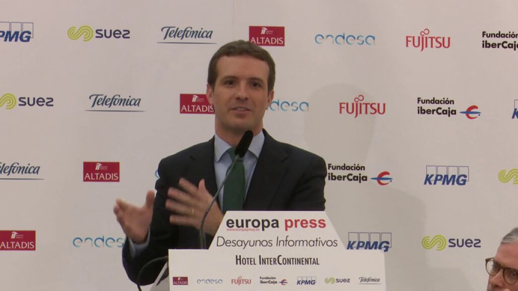 Casado ha presentado, en desayuno informativo organizado por Europa Press, la conferencia de su candidato al Ayuntamiento de Madrid, José Luis Martínez Almeida. Entre los asistentes, la candidata a la Presidencia de la Comunidad de Madrid, Isabel Díaz Ayuso, el presidente del Senado, Pío García Escudero, y el actual presidente de la comunidad, Pedro Rollán.