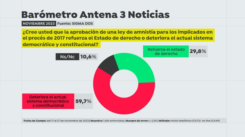 A la pregunta de "¿cree usted que la amnistía a los encausados por el 'procés' contribuirá a mejorar o resolver la convivencia en Cataluña?" la mayoría, más del 58%, opina que no.