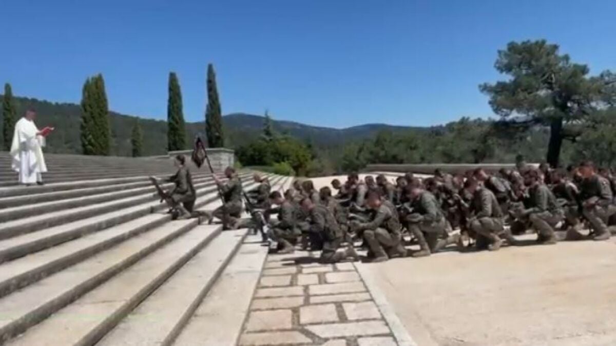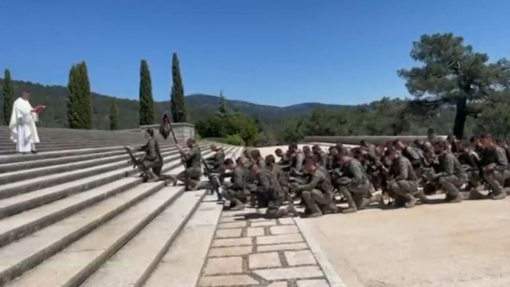 En el vídeo se puede ver cómo el sacerdote rocía con agua bendita el banderín de la unidad militar con todos los miembros arrodillados y uniformados, en el Valle de los Caídos.