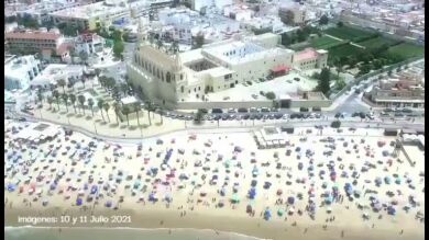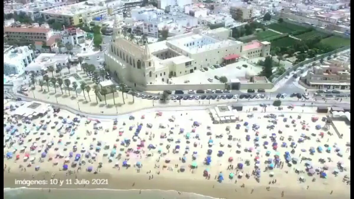 Las autoridades chipioneras han compartido un vídeo grabado con drones que utiliza los agentes municipales, donde se puede ver la distancia social en el arenal de la playa de Regla, como ejemplo de que sí es posible mantener el orden, la distancia social y la seguridad en estos lugares.