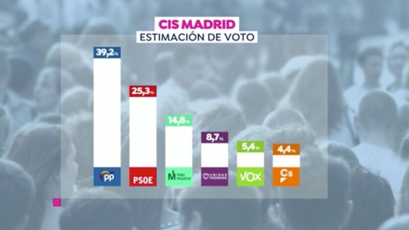 Ayuso se quedaría a 10 escaños para lograr la mayoría absoluta. El bloque de la derecha no sumaría. Según el CIS, Vox obtendría el 5,4% de los votos. Y Ciudadanos, según el CIS, no alcanzaría el 5% necesario para entrar en la Asamblea, no obtendría ningún escaño.