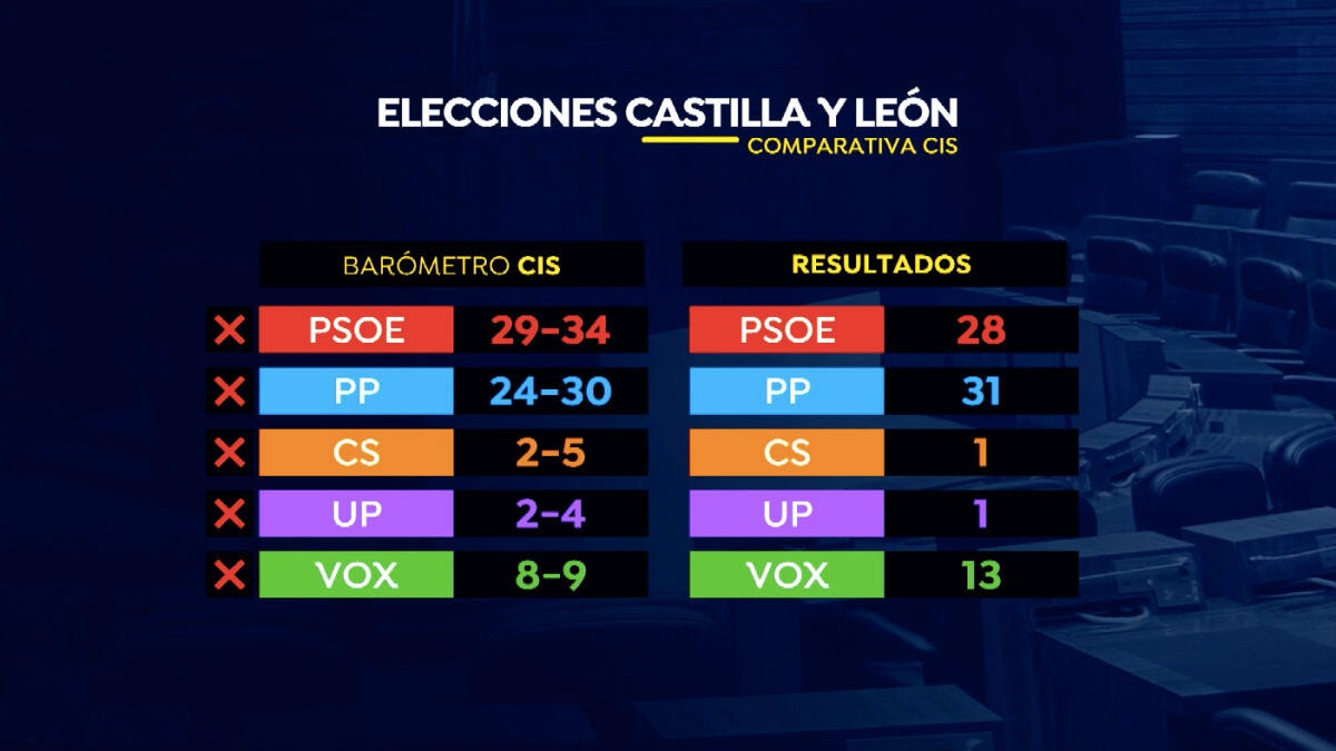Dicho de otro modo, en lo que se refiere a escaños, el CIS falla en los cinco partidos de ámbito nacional. Sí acierta con los partidos regionales. Daba una horquilla de entre 2 a 3 procuradores tanto para Unión del Pueblo Leonés como para Soria Ya: ambos han obtenido 3. También predijo entre 1 y 2 procuradores para Por Ávila, que finalmente ha logrado 1.