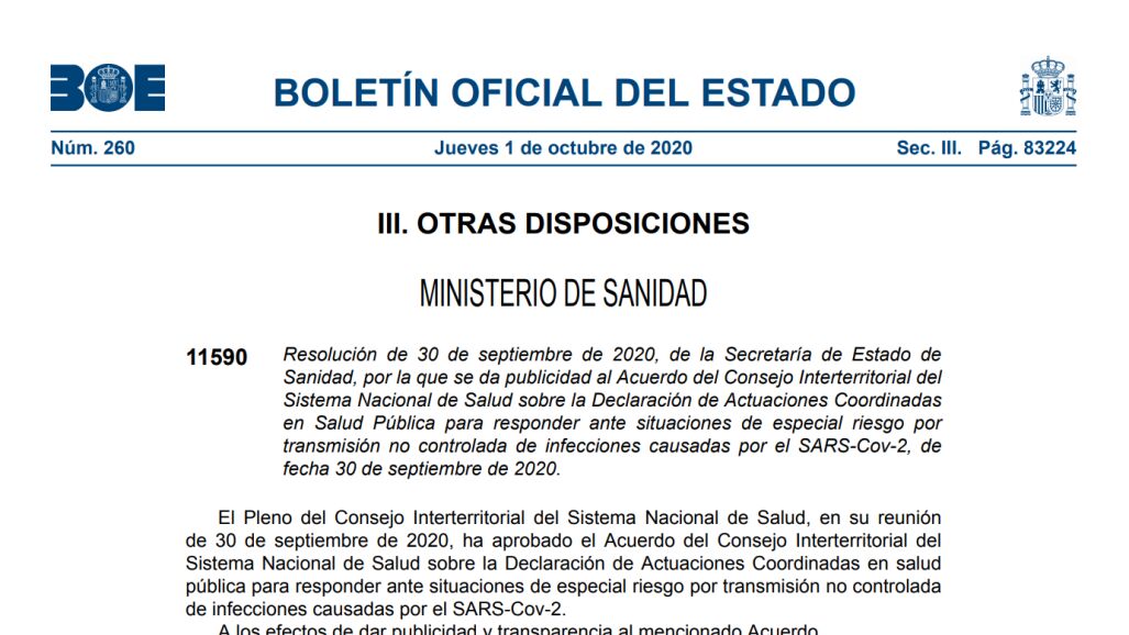 La decisión colegiada con las nuevas medidas contra el coronavirus que afectan principalmente a Madrid y otros municipios de la región se ha plasmado en una orden ministerial que se ha publicado hoy 1 de octubre en el Boletín Oficial del Estado (BOE).