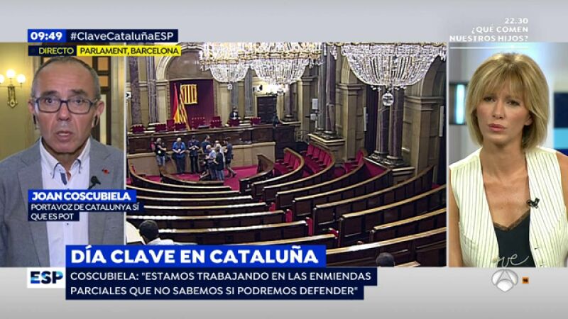 El portavoz de Cataluña Sí Que Es Pot, Joan Coscubiela, ha indicado en una entrevista en Espejo Público que su grupo va a mantener "nuestra posición dentro de la cámara, vamos a debatir hasta el final, intentando que el resultado de hoy no sea la degradación del Parlament y de la democracia", pero haciéndolo desde "la convicción de que no podemos avalar esta Ley del Referéndum ni el procedimiento bucanero con el que se pretende aprobar".