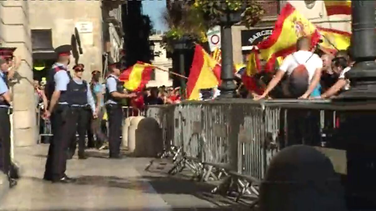 En la plaza de Sant Jaume, frente a la sede de la Generalitat, se han vivido algunos momentos de tensión tras la gran manifestación contra la independencia vivida en Barcelona. Un numeroso grupo de personas ha proferido gritos contra los Mossos y ha hecho el amago de mover las vallas de seguridad, aunque en general ha dominado el tono festivo y pacífico.