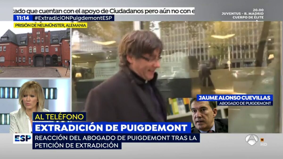El abogado de Carles Puigdemont, Jaume Alonso Cuevillas, ha analizado la decisión de la Fiscalía alemana de tramitar la extradición de Puigdemont a España. Cuevillas ha declarado que la decisión que ha tomado la Fiscalía era la esperada. "Es normal que la Fiscalía una vez recibe la euroorden decida cursarla, y por tanto pedirle al tribunal que se celebre el juicio para decidir si procede o no la euroorden" ha explicado.