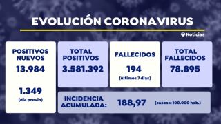 A 10 de mayo de 2021, en España hay 3.581.392 contagios y 78.895 muertos desde que comenzó la epidemia. Desde el pasado viernes se han notificado 13.984 nuevos contagios y 103 nuevos fallecimientos por covid-19.