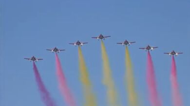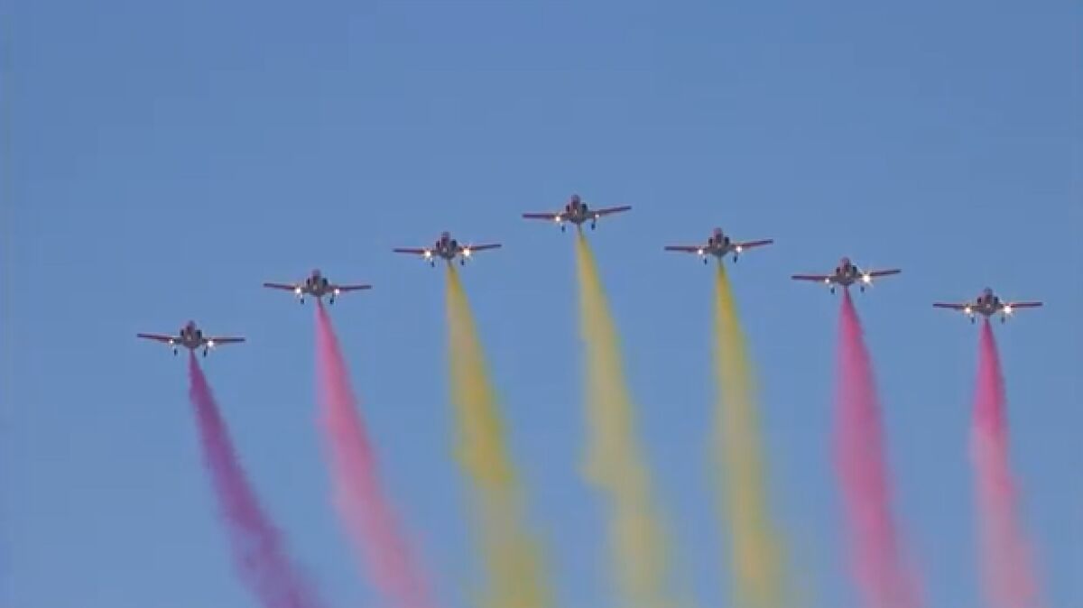 La Patrulla Águila participaba en este desfile por el Día de las Fuerzas Armadas, al pasar, los aviones dibujaban la bandera de España, pero en uno de ellos, se pudo apreciar un tono morado. Según Defensa, esto se debe a una mezcla de colores en el combustible.