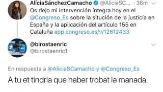 El Grupo Popular en el Congreso ha calificado como "inadmisible" el mensaje escrito por un usuario de Twitter a Alicia Sánchez-Camacho, expresidenta del PP catalán y actual miembro de la Mesa del Congreso."A ti te tendría que haber encontrado 'La Manada'", ha escrito @birostaenric en respuesta a un tuit de la dirigente popular, que recogía su intervención en el Congreso sobre la aplicación del artículo 155 en Cataluña.