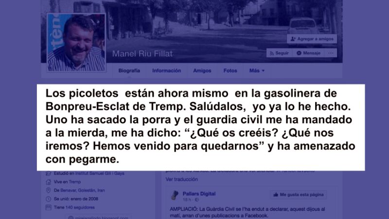 Un profesor de un instituto catalán ha sido acusado de incitación al odio en las redes sociales. Escribió mensajes como el que avisaba de que la Guardia Civil estaba en una gasolinera, daba la matrícula del vehículo y los números de identificación de los agentes. El profesor fue detenido pero quedó en libertad tras negarse a declarar.