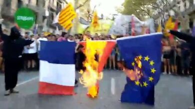 En su cuenta de Twitter, la parlamentaria ha difundido la quema de banderas de España, de Francia y de la UE por parte de encapuchados durante la manifestación por la Diada organizada por el colectivo de izquierda radical independentista Arran, situado en la órbita de la CUP.