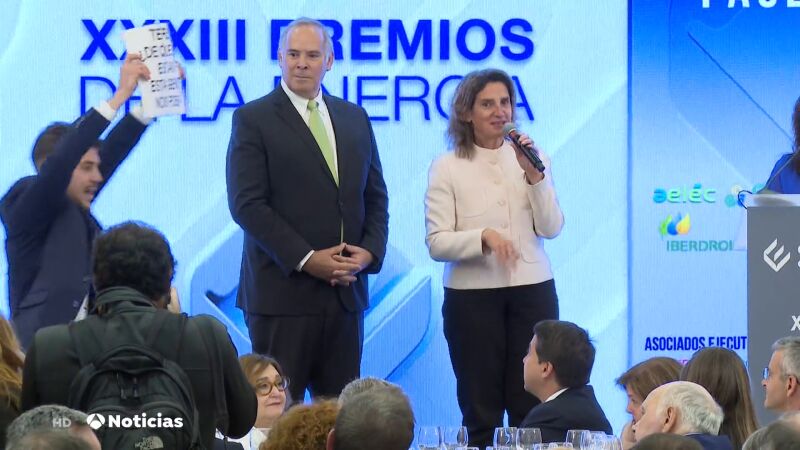 Los ecologistas de Greenpeace han boicoteado una entrega de premios en Madrid, en presencia de la ministra Teresa Ribera, durante mañana de hoy miércoles 17 de mayo. Los individuos levantaron una pancarta frente a la vicepresidenta tercera del Gobierno que decía "Teresa, ¿De qué lado estás? Esta gente nos roba" y repitiendo la misma frase ante el público.