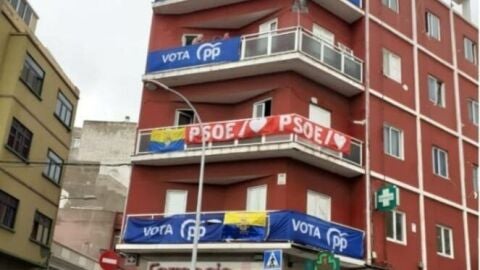 El uso publicitario de un edificio de Las Palmas de Gran Canaria ha derivado en una curiosa imagen. En cuatro de sus cinco plantas se lucen pancartas electorales del Partido Popular. En otra, una del PSOE.