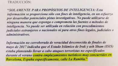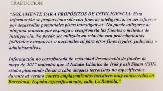 Los servicios de Inteligencia de Estados Unidos mandaron un correo electrónico al Centro de Inteligencia contra el Terrorismo y el Crimen Organizado (CITCO) de España cuatro días después del atentado yihadista en Barcelona con el documento que había sido enviado el pasado 25 de mayo a Mossos d'Esquadra alertando de un posible ataque en La Rambla.