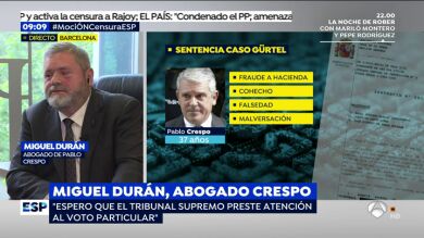 Miguel Durán, abogado de Pablo Crespo, valora la sentencia contra su cliente como un texto que tiene "un marcado caliz político", algo que no le "extraña" por los "antecedentes" de España y del magistrado José Ricardo de Prada. "Tenemos recusado al magistrado De Prada por su parcialidad que la sentencia confirma", ha recordado.