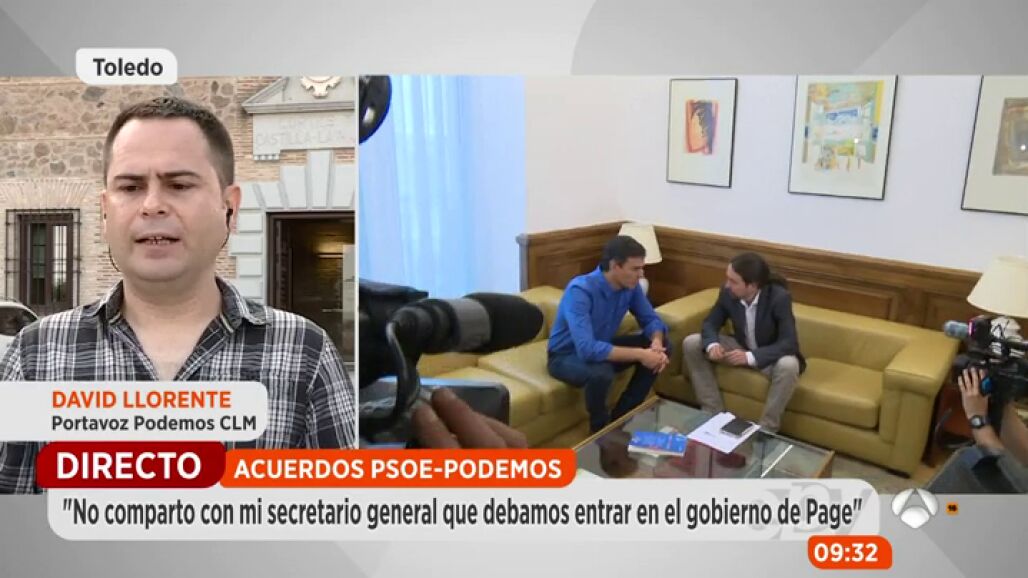 David Llorente, uno de los dos diputados de Podemos en Castilla-La Mancha y el único que no está de acuerdo con el pacto con el PSOE y portavoz de la formación morada, explica que su partido no debería entrar en el gobierno de Emiliano García Page porque lo que toca "fiscalizar" la labor del gobierno del PSOE y eso se debe hacer desde la oposición "exigente y propositiva". Al mismo tiempo, considera que se deben seguir constituyendo como alternativa de gobierno frente al PP y al PSOE, algo que no sería posible siendo partícipes de las políticas socialistas.