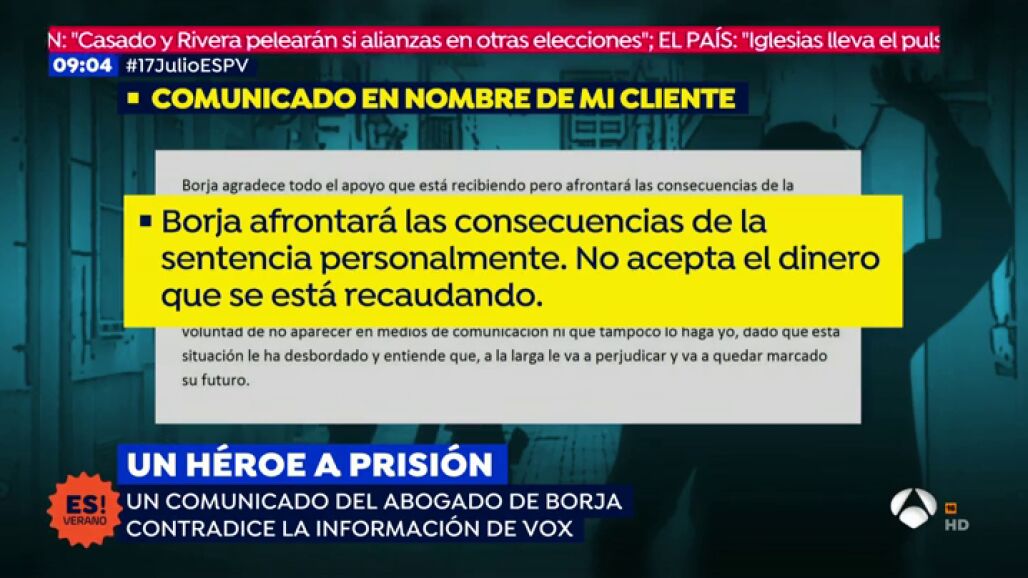 El letrado de Borja explica que tampoco aceptará el dinero que se está recaudando a través del 'crowdfunding' lanzado por Vox porque, "de ningún modo", quiere que se pueda deducir que él se va a lucrar con esas cantidades.
