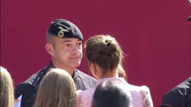 El paracaidista que ha chocado contra una farola se emociona durante el saludo a la Familia Real