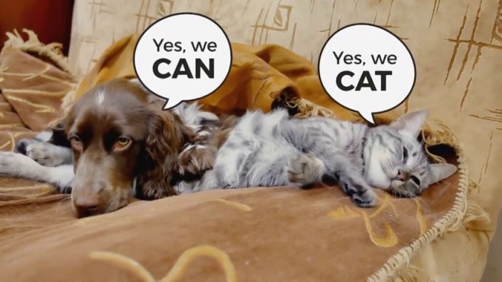 Esta felicitación de Navidad en vídeo comienza con un plano en el que se ve a un perro y un gato tumbados juntos, tranquilos y abrazados sobre un sofá. El perro dice "Yes you can" y el gato contesta "Yes we cat".