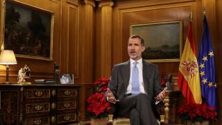 Felipe VI se ha dirigido a los españoles en su mensaje de Nochebuena por primera vez desde el Salón de Audiencias del Palacio de la Zarzuela, un escenario que utilizó don Juan Carlos en su última alocución navideña y en el que le han acompañado una fotografía familiar y las banderas de España y la UE.