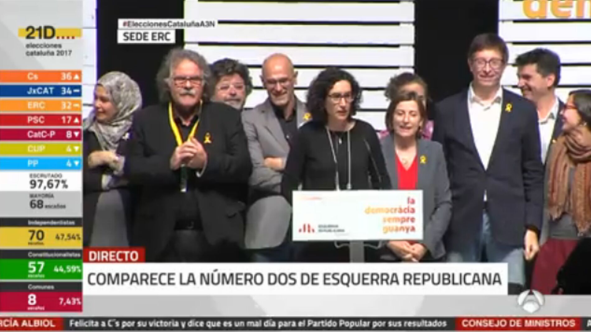 La principal candidata de ERC en las elecciones del 21-D, Marta Rovira, ha afirmado que los catalanes han votado "república" y "en contra del 155" pese a que su partido, con 32 diputados (y un 21,42% de los votos) no ha ganado estos comicios tal y como esperaba.