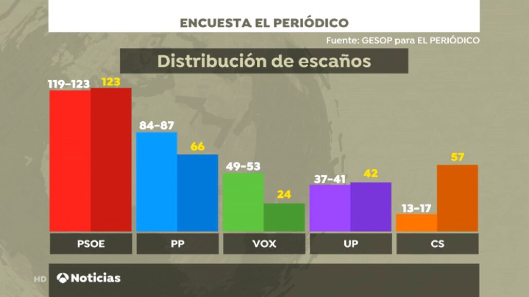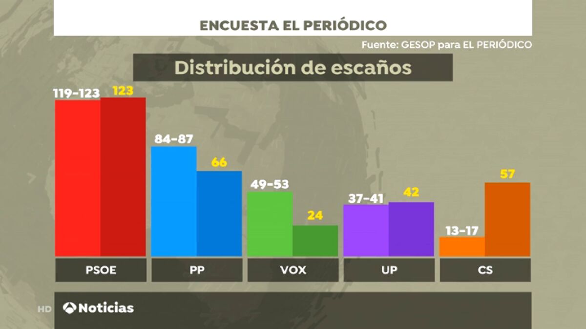 Una encuesta publicada este domingo por 'El Periódico' revela que el PSOE volvería a ganar las elecciones con un resultado muy similar al de abril y obtendría entre 119 y 123 diputados, mientras que el PP pasaría de los 66 escaños a obtener entre 84 y 88 y Cs de 57 a entre 13 y 17. Vox se convertiría en tercera fuerza con entre 49 y 53 escaños.