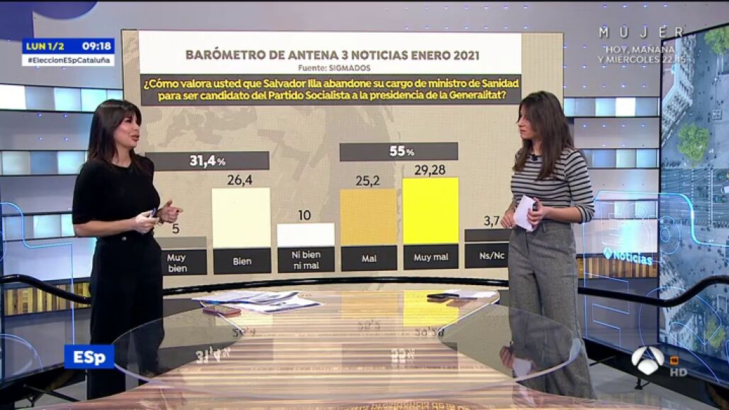 El 14 de febrero se celebrarán las elecciones catalanas en plena tercera ola de la pandemia del coronavirus. El 55% de los encuestados de SigamDos para Antena 3 Noticias valora de forma muy negativa que Salvador Illa haya abandonado el ministerio de Sanidad para presentarse a las elecciones de Cataluña. El 31,4% lo valora de forma positiva y el resto o no sabe no contesta o lo valora ni bien ni mal.