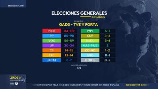 El PSOE ganaría las elecciones celebradas en el día de hoy con una horquilla de 114 a 119 escaños, una cantidad inferior a los comicios del 28 de abril, cuando consiguió 123 escaños, según el sondeo de GAD3 para RTVE y La FORTA.