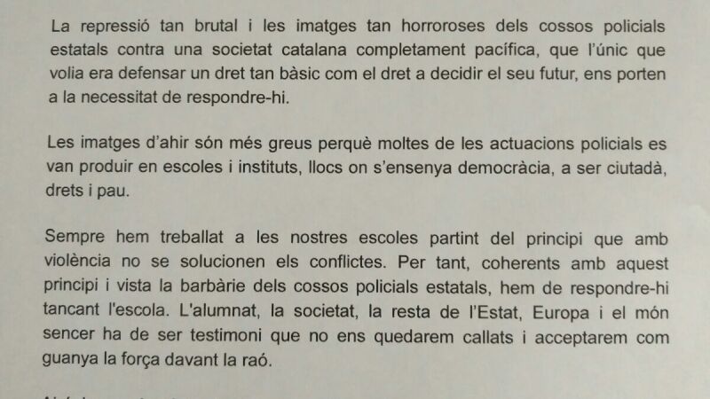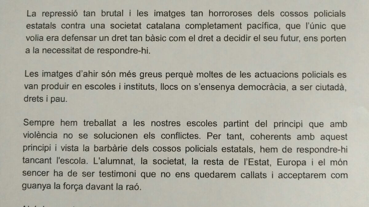 Un colegio ha enviado una nota a los padres de sus alumnos en la que condena "la represión tan brutal y las imágenes horrorosas de los cuerpos policiales" y explica que este 3 de octubre no se impartirán clases