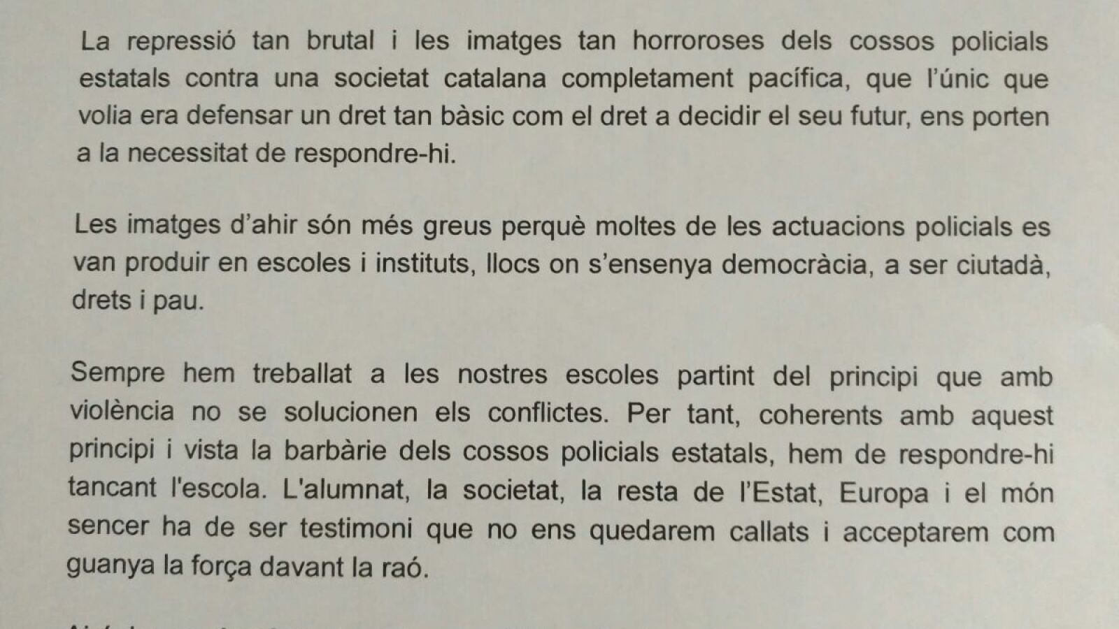 En una nota, el colegio denuncia "la represión tan brutal y las imágenes tan horrorosas de los cuerpos policiales estatales contra una sociedad catalana completamente pacífica", de la que subrayan "lo único que quería era defender un derecho tan básico como es el derecho a decidir su futuro".