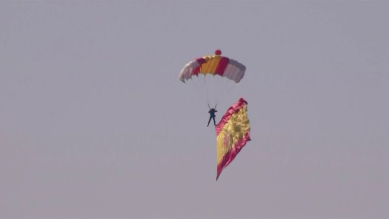 La PAPEA ha realizado el tradicional salto paracaidista en el comienzo del desfile militar con motivo del día de la Fiesta Nacional.