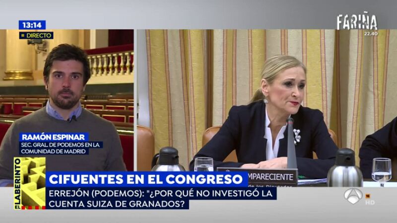 El secretario general de Podemos en la Comunidad de Madrid, Ramón Espinar, ha criticado que Cristina Cifuentes aún no se haya pronunciado sobre la presunta falsificación de sus notas para obtener un máster. "Cristina Cifuentes suele salir a dar explicaciones muy rápido y hoy parece que está escondida y sin saber qué decir", ha apuntado.
