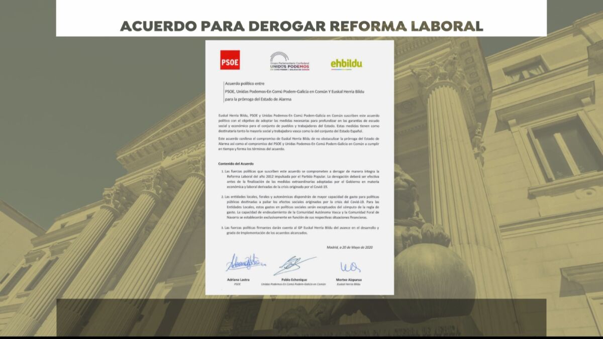 En el primer punto se recoge: "las fuerzas políticas que suscriben este acuerdo se comprometen a derogar de manera íntegra la reforma laboral de 2012impulsada por el Partido Popular. La derogación será efectiva antes de la finalización de las medidas extraordinarias adoptadas por el Gobierno en materia económica y laboral derivadas de la crisis originada por el Covid-19.