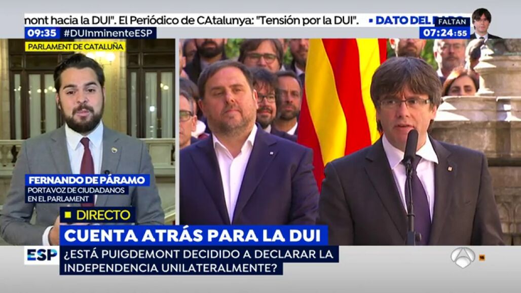 En opinión de De Páramo, Puigdemont "puede declarar la independencia en cualquier momento, es su objetivo final, su hoja de ruta es clara" y afirma que aunque Puigdemont "intentará sacarnos de España y Europa, no lo va a conseguir". Dice que "estamos viviendo los últimos días del procès, un proceso agotado, agotador" y cree que "la aplicación del 155 tiene que ser el Gobierno quien la lleve a cabo".