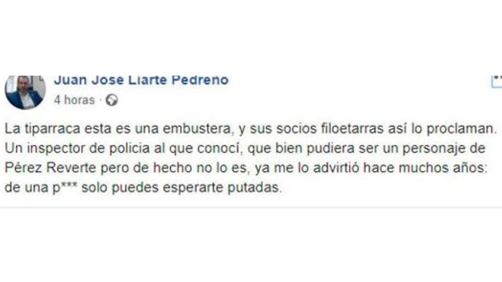Tras el aluvión de críticas, Liarte eliminó este mismo domingo la publicación para después publicar una aclaración. "Parece que no me he explicado bien", ha señalado, para después apuntar que con esa frase no se refería a Delgado, "sino a un señor de Bildu".
