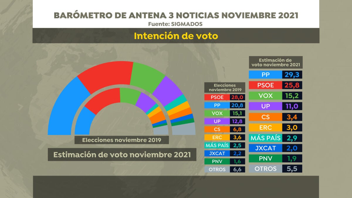 El Partido Popular mantiene los resultados del anterior barómetro y lograría mayoría absoluta con el apoyo de Vox, que llegaría a los 47 diputados. Son los datos que refleja la encuesta electoral de Sigma 2 para Antena 3 Noticias de este mes de noviembre. Por su parte, el PSOE recupera un escaño y Unidas Podemos suma dos más para llegar a los 26.