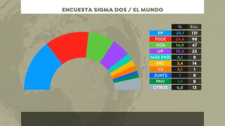 El Partido Popular obtendría el 28,8% de los votos, seguido del PSOE, con un 25,7% y 102 escaños, y la formación de Santiago Abascal, que se haría con el 15,7% de los votos y 52 escaños, de acuerdo al sondeo de Sigma 2 para Antena 3 Noticias