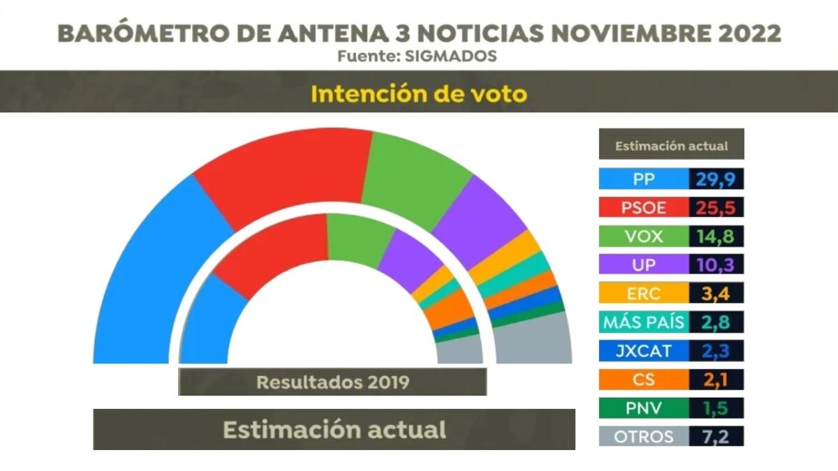 El tablero político español se encuentra en continuo movimiento y, según la última encuesta electoral elaborada por Sigma Dos para Antena 3 Noticias, de celebrarse hoy las elecciones generales en España el PP sería el partido más votado, sin embargo los de Alberto Núñez Feijóo pierden 1,1 puntos con respecto a la encuesta de octubre. Una bajada que también afecta al PSOE aunque en menos de medio punto.