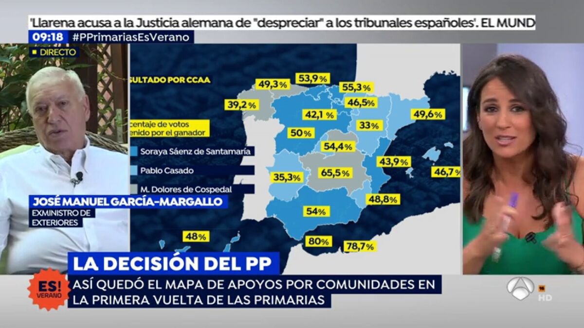 Margallo ha rechazado que Santamaría sea la candidata de las bases. "Me parece una grosera distorsión de la realidad decir que Soraya Sáenz de Santamaría es la candidata de las bases" y recalca que "es obvio" que es Casado quien "ha empezado de arriba a abajo".