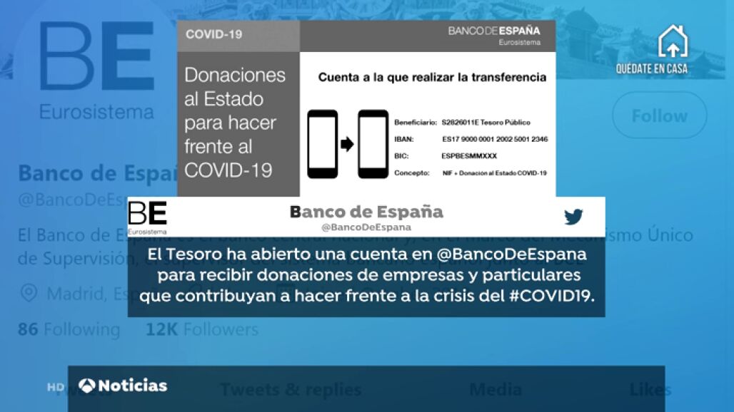 Cualquier entidad privada o particular que quiera hacer donaciones al Estado para hacer frente a la crisis del coronavirus podrá realizar una transferencia en el IBAN ES17 9000 0001 2002 5001 2346 o el BIC ESPBESMMXXX, bajo el concepto NIF + Donación al Estado COVID-19.