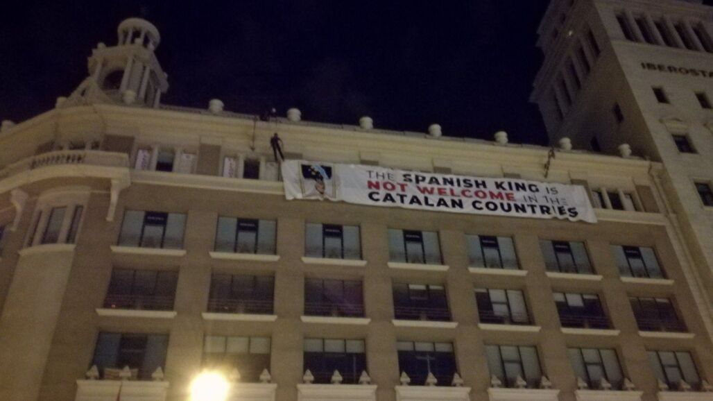 Un grupo de independentistas ha descolgado este viernes por la tarde esa pancarta que instalaron durante la noche anterior en la fachada de un edificio de la plaza Cataluña en contra de la presencia del Rey en Barcelona para participar en el homenaje a las víctimas de los atentados del 17A. Según ha podido comprobar Efe, la pancarta, colgada en el edificio con un lema que afirmaba en inglés que el Rey no era bienvenido a Cataluña, ya no es visible, horas después de que haya finalizado el acto de homenaje a las víctimas del atentado.