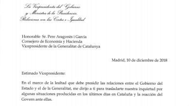 En la misiva remitida por la vicepresidenta al conseller Pere Aragonès, Calvo denuncia que "aparentemente" ha existido una "dejación de funciones" por parte del Ejecutivo autonómico, con consecuencias de carácter económico y social y para la seguridad pública. "En este sentido es nuestra obligación evaluar los posibles incumplimientos del ordenamiento jurídico que se hayan producido", asegura Calvo, sin perjuicio, avisa, de otros requerimientos en curso sobre "actos concretos y sus posibles responsabilidades".