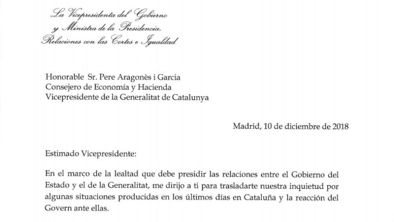 "Aparentemente ha existido una dejación de funciones que tiene atribuidas ese gobierno, con consecuencias tanto de carácter económico y social como para la seguridad pública", advierte la vicepresidenta del Gobierno, Carmen Calvo, en su misiva.