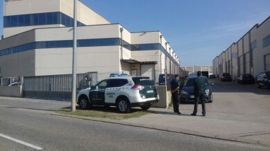 Dos vehículos de la Guardia Civil vigilan los accesos a la imprenta donde, según fuentes oficiales, podría imprimir el censo para el referéndum independentista. Desde la empresa aseguran que siguen trabajando con normalidad y que no se ha interrumpido la producción.