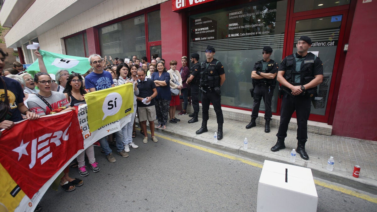 Los vecinos concentrados a las puertas de la rotativa han cantado 'Els segadors' y han llevado una pancarta y una urna con la que han simulado una votación. En la concentración espontánea frente a los agentes de la benemérita, que escoltan la puerta en la sede de El Vallenc, hay miembros de la ANC, de Omnium Cultural, de ERC y de la CUP.