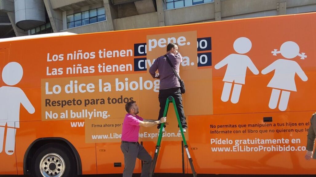 Este colectivo puso en circulación este autobús en respuesta a la campaña de la asociación vasca Chrysallis Euskal Herria en favor de los derechos de los niños y niñas transexuales "Hay niñas con pene y niños con vulva". La sección número dos de la Audiencia Provincial entiende que no puede considerarse un "atentado a la juventud y la infancia que una asociación legalmente constituida pueda dirigirse a los padres -en general- y a quienes la Constitución garantiza el derecho a formar a sus hijos 'de acuerdo con sus propias convicciones'".